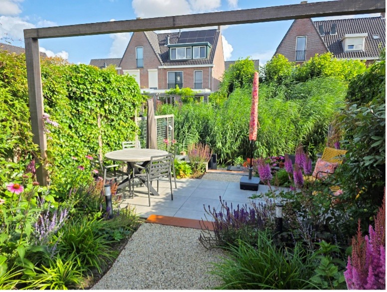 De beplanting is opgebouwd vanuit een maatwerk beplantingsplan met kleurrijke vaste planten en siergrassen, afgestemd op de verschillende niveaus en zichtlijnen in de tuin.